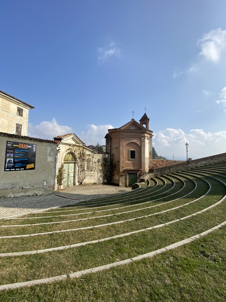 Al culmine, trovate l’iconico Auditorium Horszowski. Questo non è un teatro costruito, ma un magnifico anfiteatro naturale, ricavato dalla piazza antica sfruttando la pendenza del terreno. La sua bellezza è data dal fondale storico: la Torre Campanaria romanica (resto della chiesa medievale demolita), le mura del Castello Scarampi e gli Oratori antichi che incorniciano il palco.